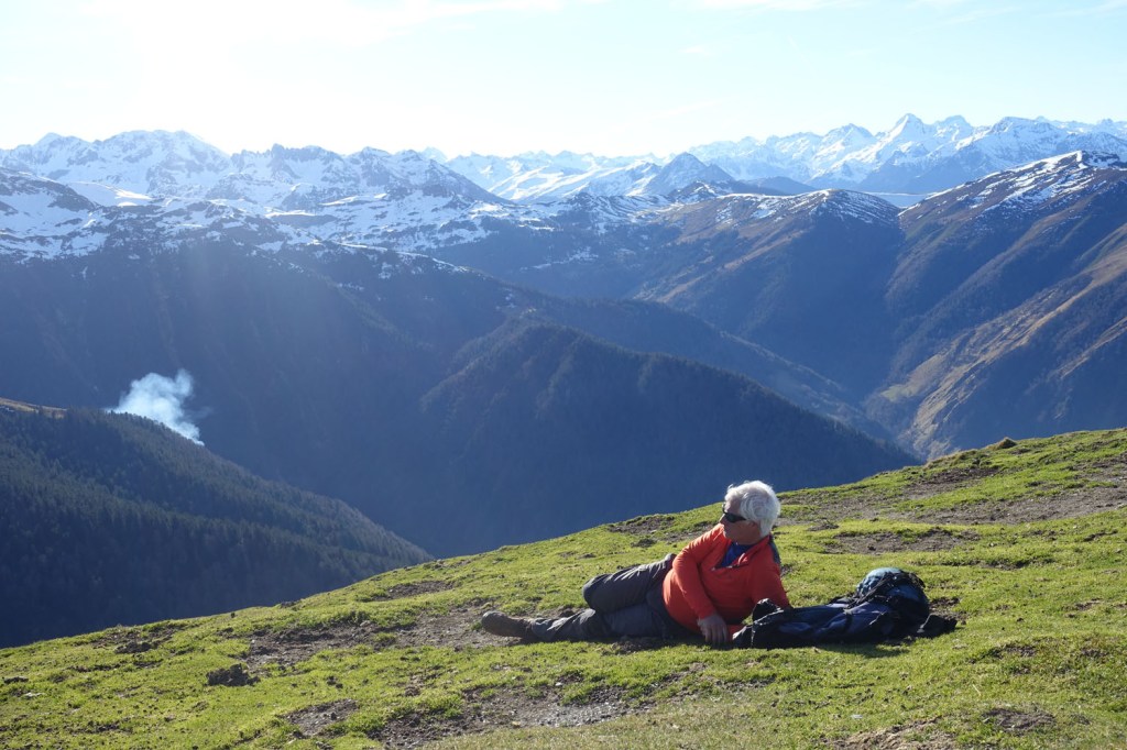 Tout près de la cabane, sous les pins à crochets pousse une jolie pelouse. Elle est un peu fraîche (en fait encore gelée) mais nous nous régalons du bon Muscadet de vendanges tardives choisi par Martine, avant une bonne sieste de 45 minutes .