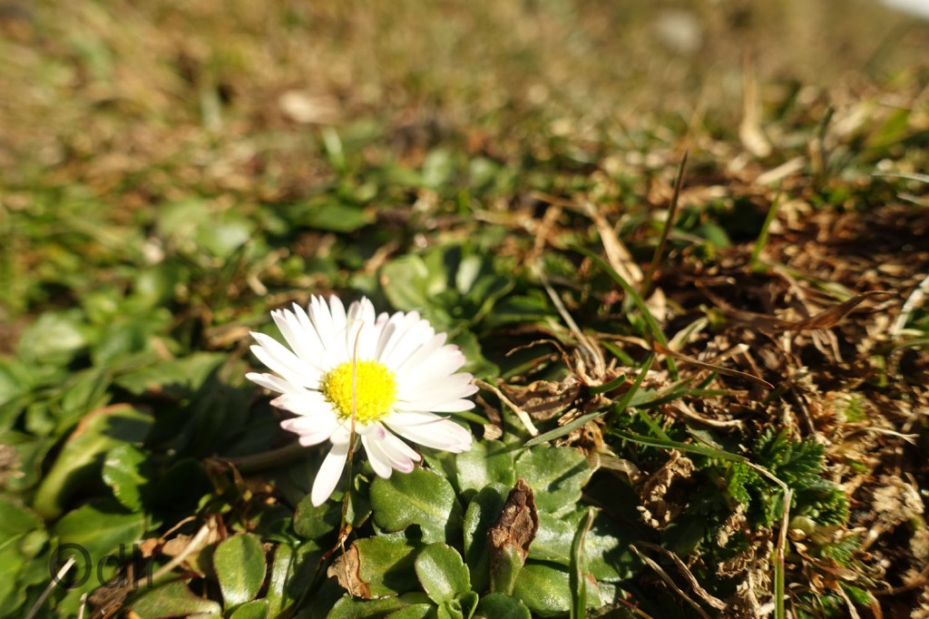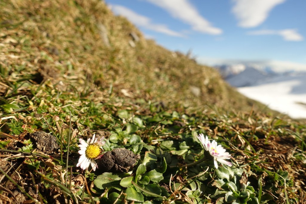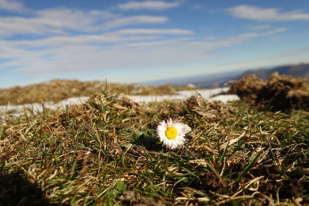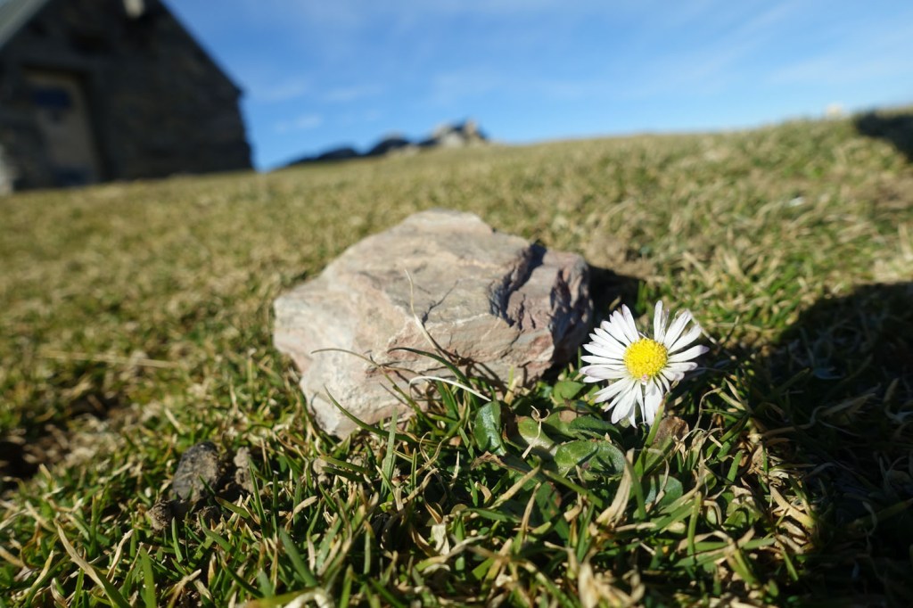 Le cadeau du jour : Une paquerette qui a éclos en ce 8 janvier à 1450 m d’altitude, juste devant la cabane …