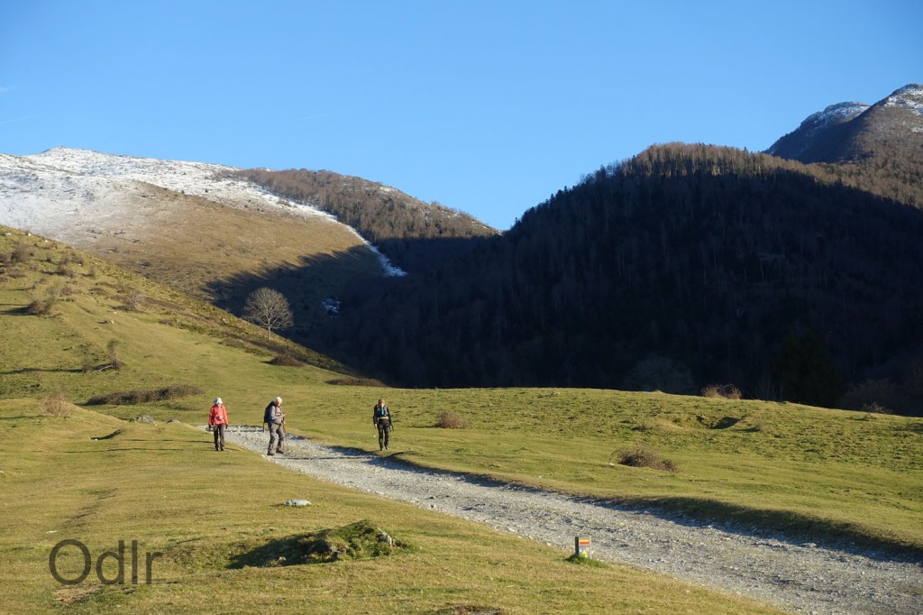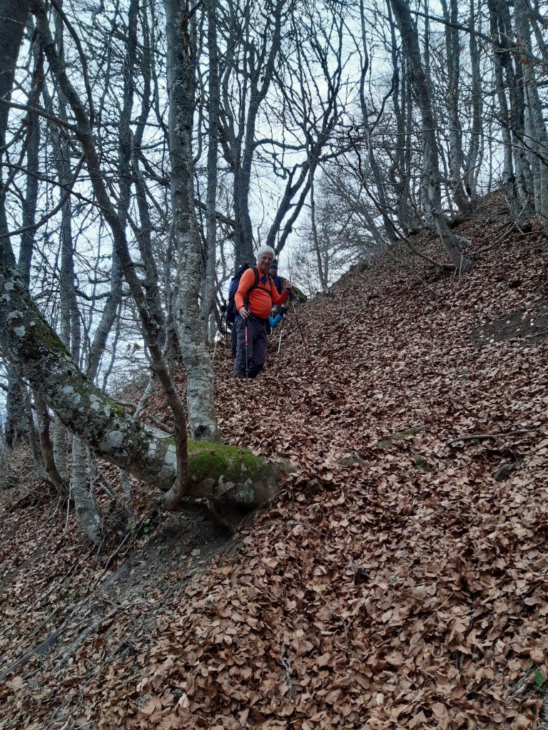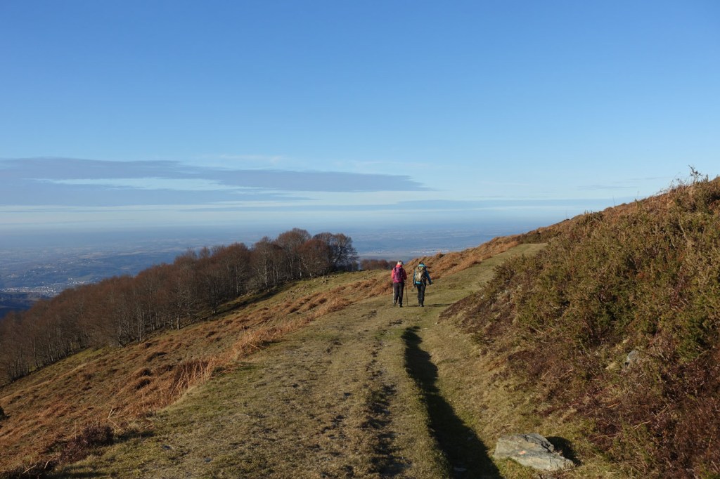 La montée est très facile, puisqu’on peut suivre une piste jusqu’au Col de Couret, à travers bois et pâturages. Avant d’arriver au Col nous avons bavardé avec un chasseur qui participait à une battue au sanglier. Ils sont nombreux dans ces forêts du piémont, qu’ils se partagent avec des cerfs et des chevreuils.