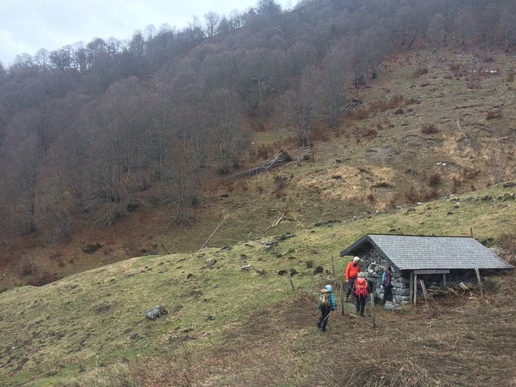 Une rapide consultation des troupes nous conduit à viser le Col de Louvie, ce qui nous prend 1 h 30 sur un chemin bien balisé, mais en mauvais état et plusieurs passages sont glissants, en particulier dans la forêt avant la jolie cabane d’algue Morte où le chemin est recouvert de feuilles de hêtre sur une épaisseur pouvant atteindre 50 cm !