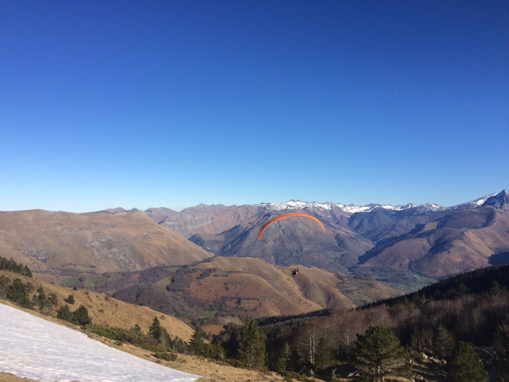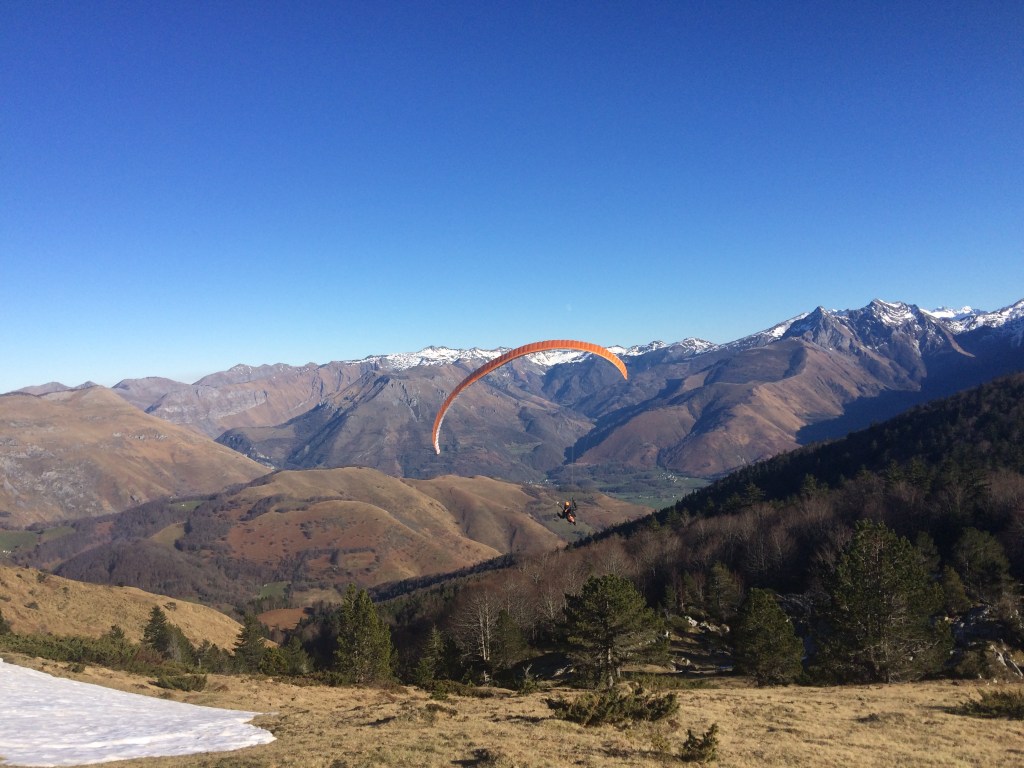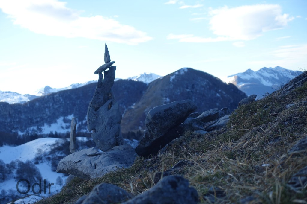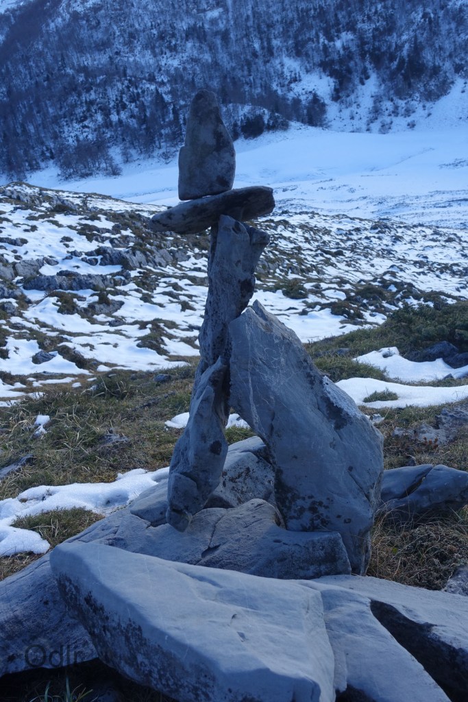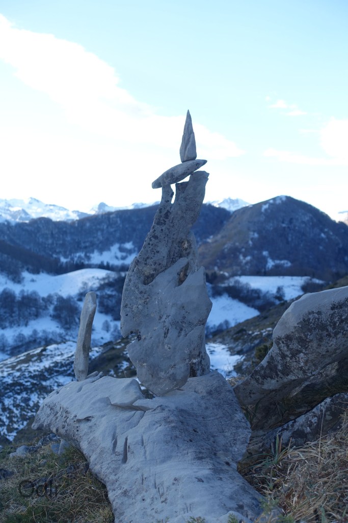 Retour vers la voiture avec un grand soleil, un peu frais… et nous assistons à l’envol d’un parapentiste qui va se régaler ! Construction d’un joli cairn et à la prochaine fois, peut etre avec les raquettes (pentes raisonnables, aucun risque d’avalanches) . En cas de sortie neige, il faudra faire attention à l’état de la route . Pour l’été, c’est un point de départ vers le Pic des Tourelles, qui mène aux Orgues de Camplong, ou vers le Pas de Losque et un joli tour en vallée de Lescun.