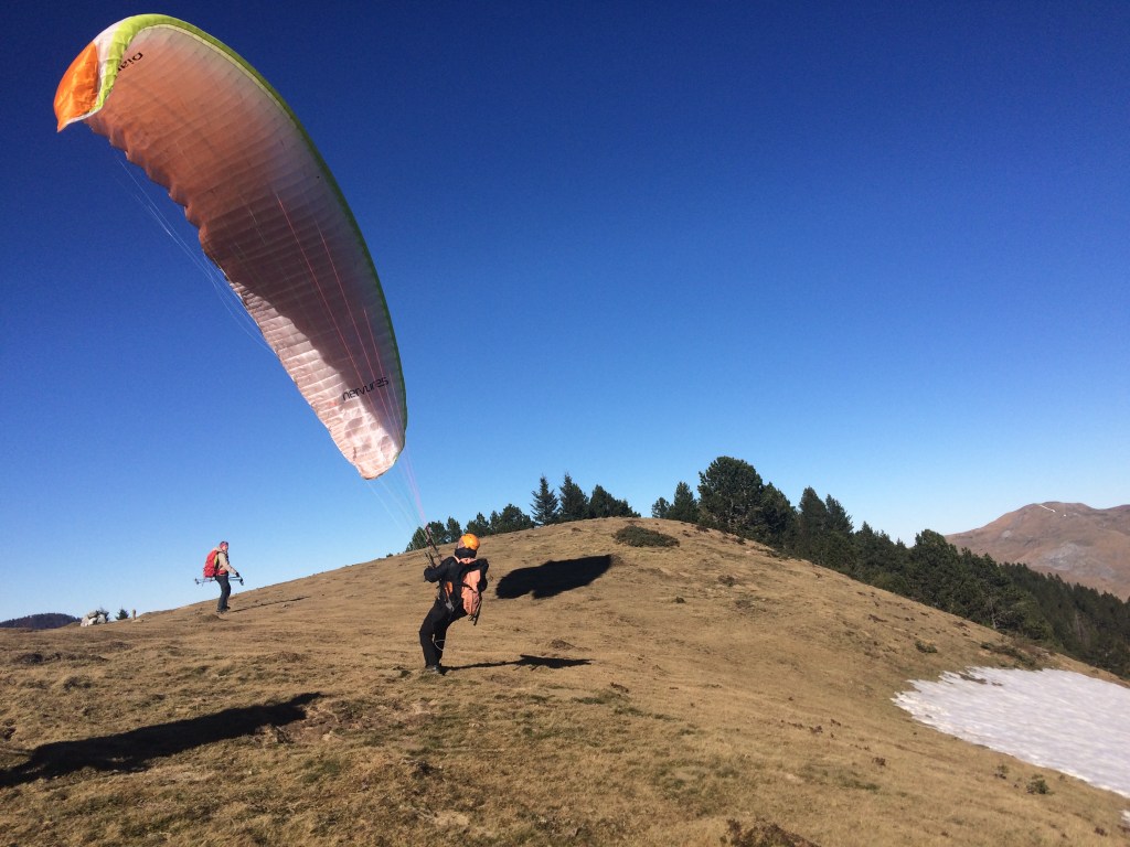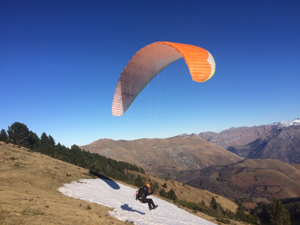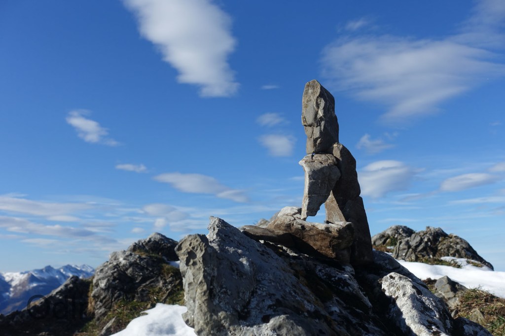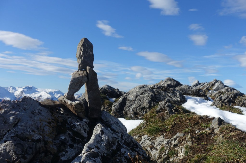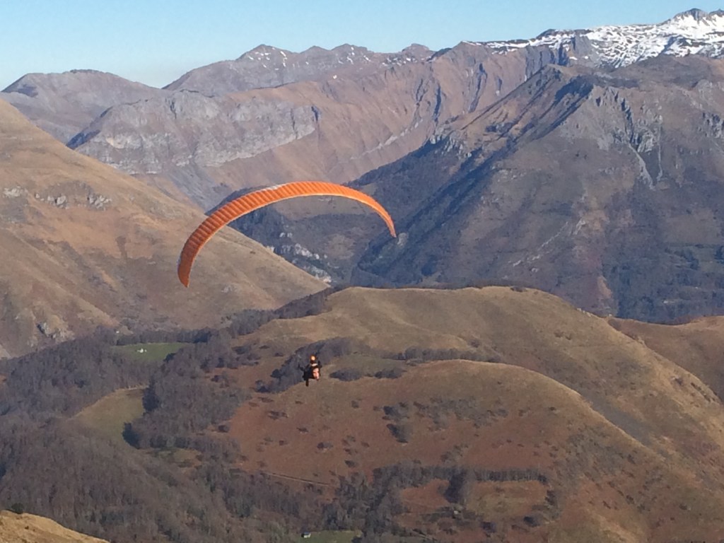 Retour vers la voiture avec un grand soleil, un peu frais… et nous assistons à l’envol d’un parapentiste qui va se régaler ! Construction d’un joli cairn et à la prochaine fois, peut etre avec les raquettes (pentes raisonnables, aucun risque d’avalanches) . En cas de sortie neige, il faudra faire attention à l’état de la route . Pour l’été, c’est un point de départ vers le Pic des Tourelles, qui mène aux Orgues de Camplong, ou vers le Pas de Losque et un joli tour en vallée de Lescun.