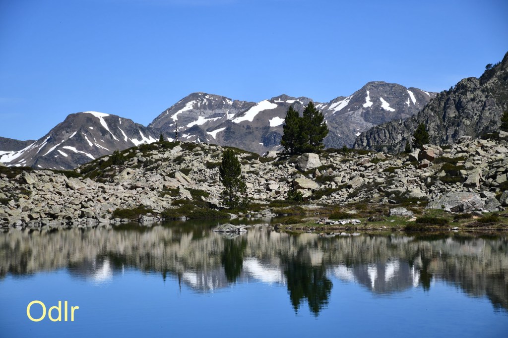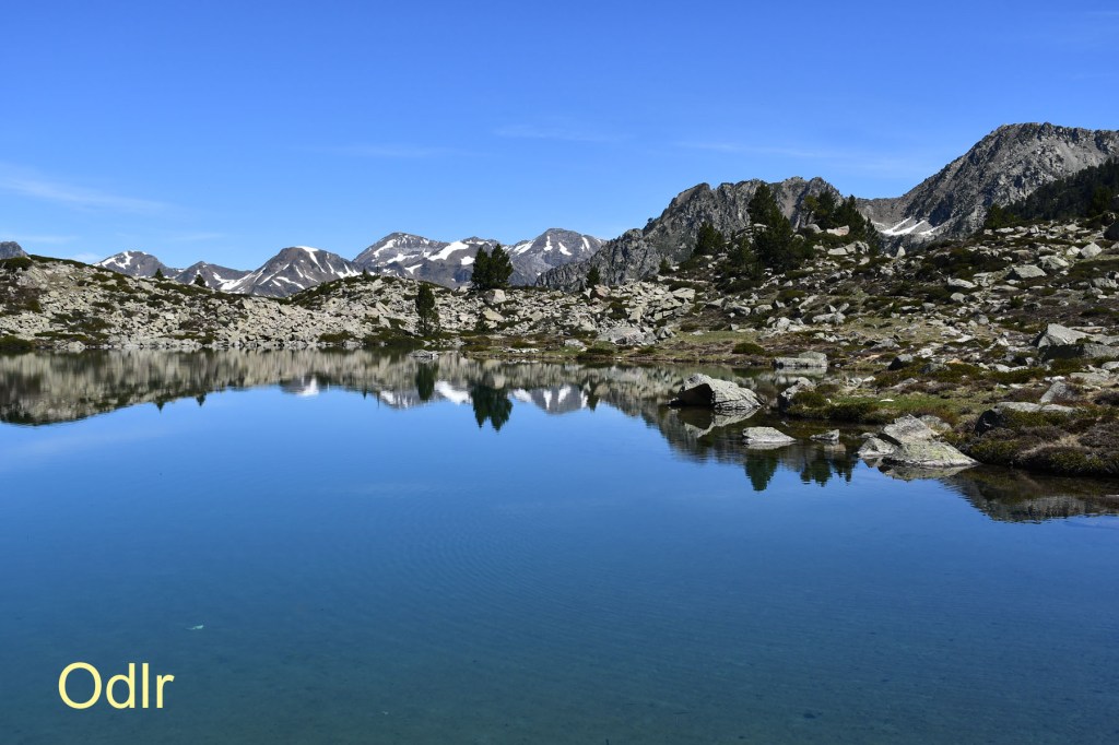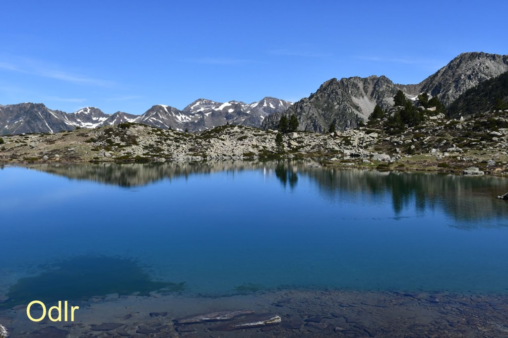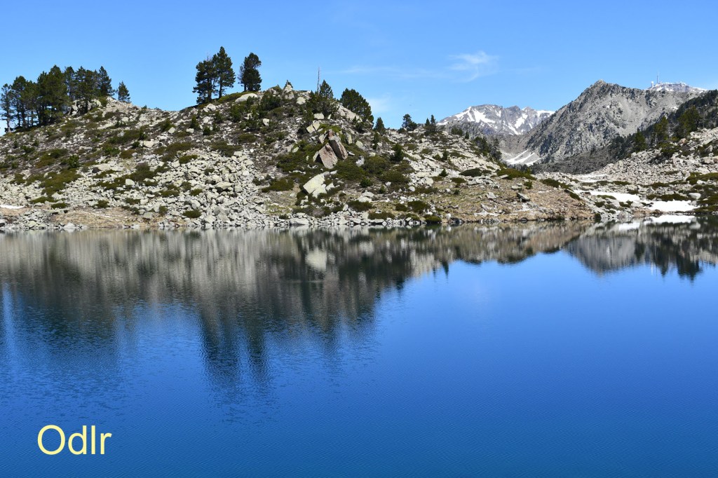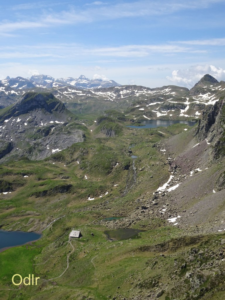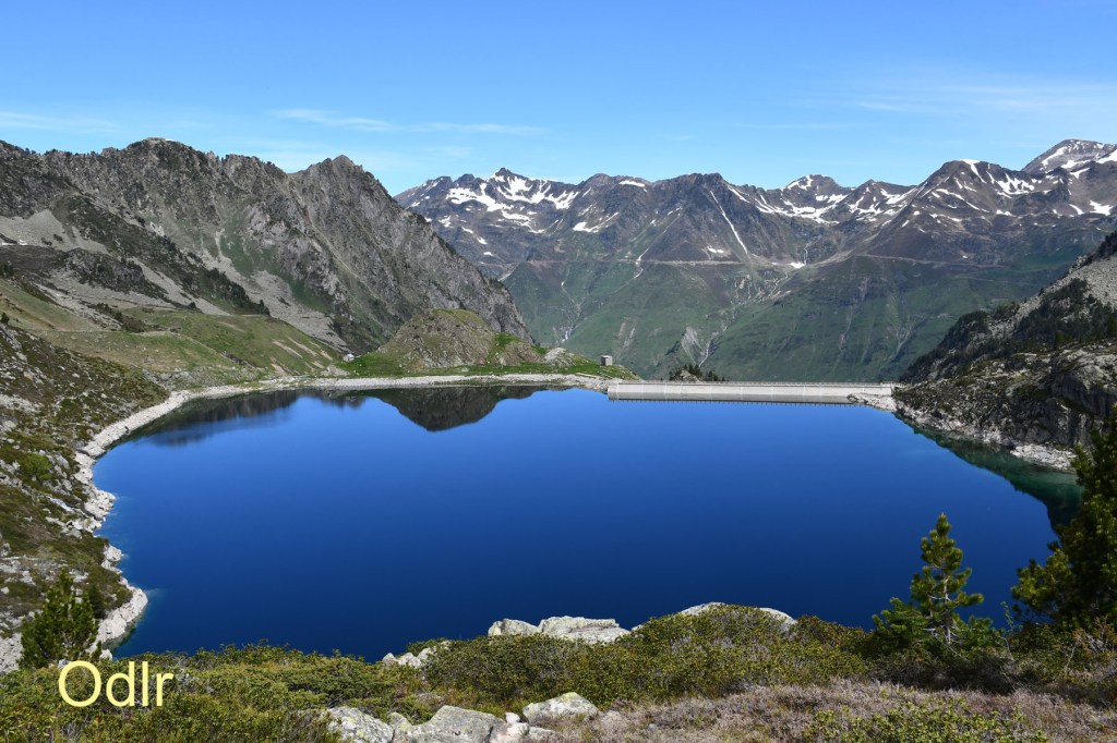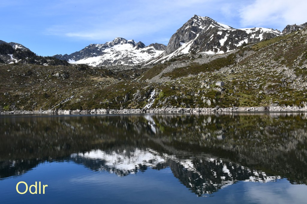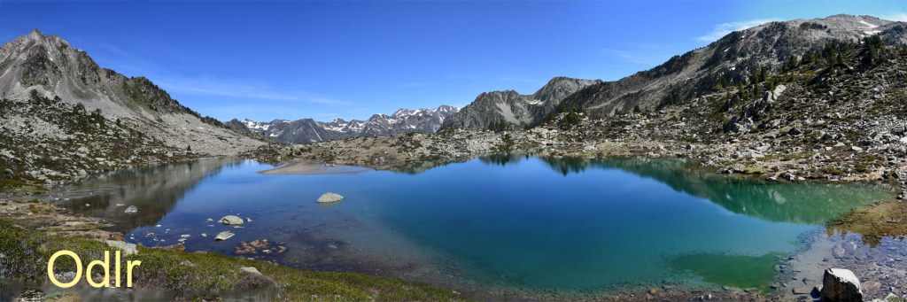 Le Lac d’Ets Coubous, vu depuis la crête du Lac Blanc.. Au fond : la vallée de Barèges Reflets dans le lac : les pics d’Astazou, la Mourelle et Espade